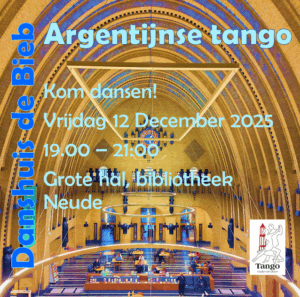 Kom tango dansen bij Danshuis de Bieb! Op vrijdag 12 december laten we Utrecht kennis maken met de Argentijnse tango. Met een proefles van Tango La Zapada en daarna vrij dansen in de prachtige hal van de bibliotheek op het Neude. Ervaring niet nodig. Neem je familie, vrienden, buren en kennisen mee!